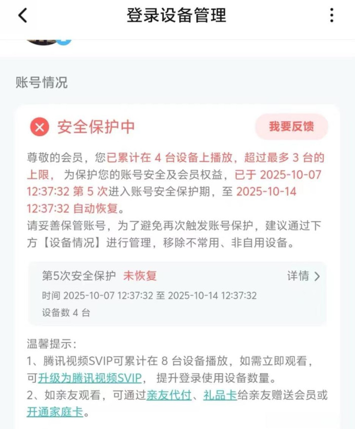 10月初,上述网友将腾讯视频“封号”会员的话题送上热搜。根据其发布的截图,其腾讯视频账号处于“安全保护中”,而原因是,其VIP账号已累计在4台设备上播放,超过最多3台的上限。平台称,为保护账号安全及会员权益,该账号于10月7日进入第4次账号保护期,至10月14日自动恢复。
