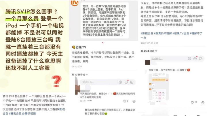 其中有网友提到,“限制设备我能理解,但手机、平板和电脑都是不同设备了,这样限制已经不是无法共享账号给亲朋好友,而是给单人使用都造成障碍了吧。”并表示,“难怪疯狂缩减会员权益,都是为了SVIP啊。”